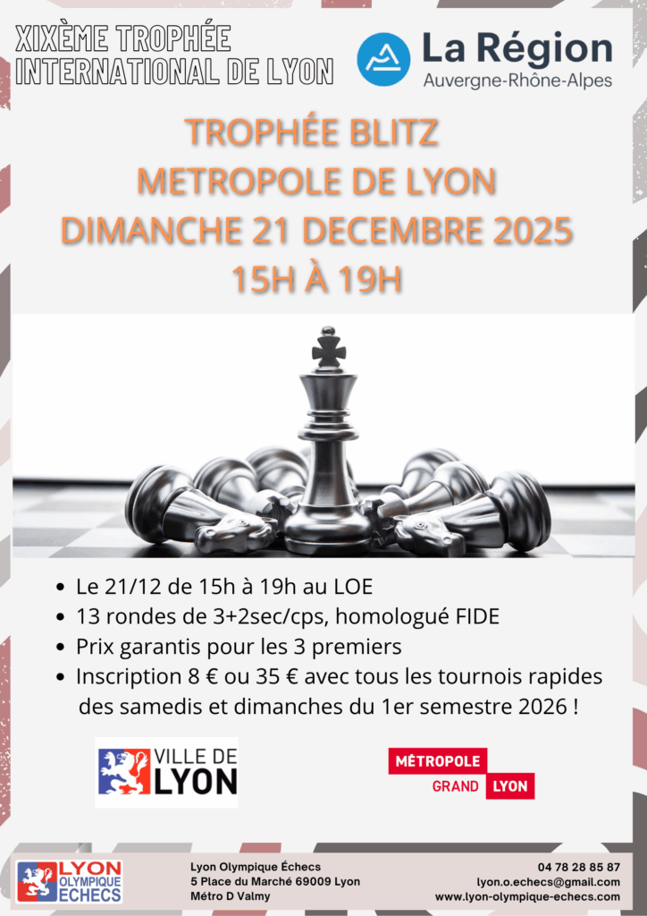 Le Trophée International cadence blitz aura lieu le dimanche 21 décembre 2026 au Lyon Olympique Echecs.