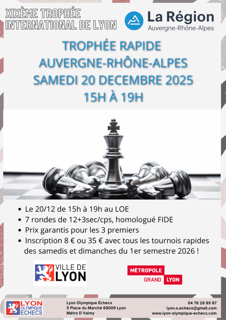 Le Trophée International cadence rapide aura lieu le samedi 20 décembre 2025 au Lyon Olympique Echecs.