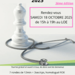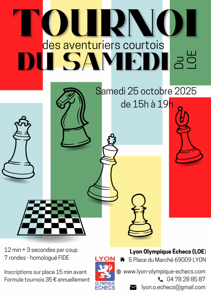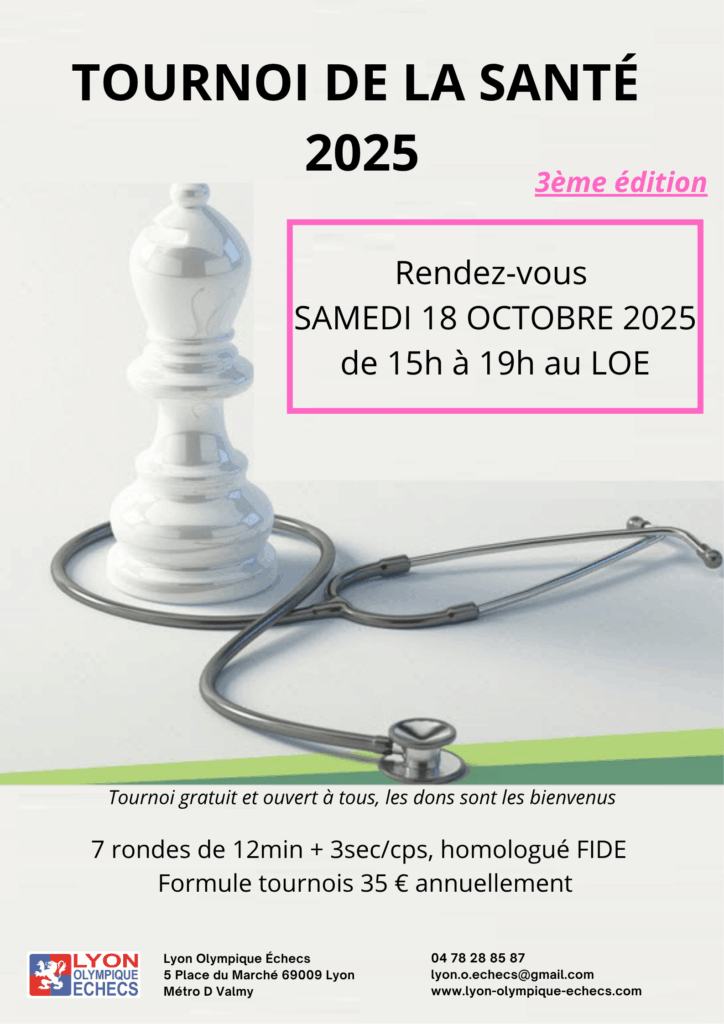 3 tournois Rapides durant 3 samedis de suite de 15h à 19h30 dont un dit de la Santé au club Lyon Olympique Echecs ! Stages jeunes et adultes aussi !