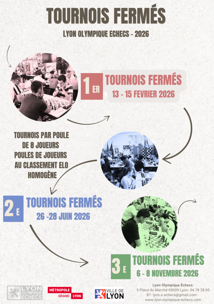 Les tournois toutes rondes sont ouverts à tous et réunissent des joueurs par niveau de classement elo similaire. Ce tournoi se déroulera du 13 au 15 février 2026 au Lyon Olympique Echecs, 5 Place du Marché 69009 Lyon.