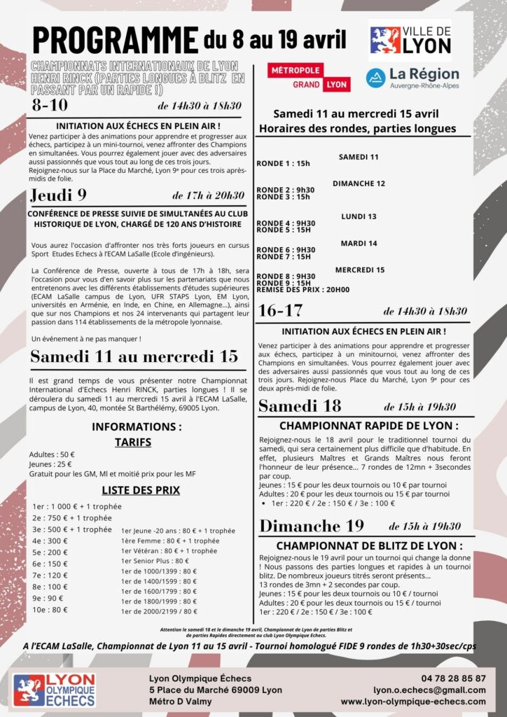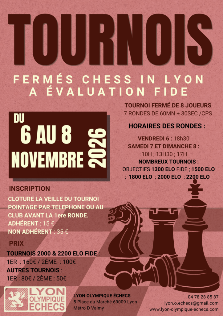 Ainsi que les Championnats de Lyon de parties rapides et de Blitz des 18 et 19 avril 2026 !