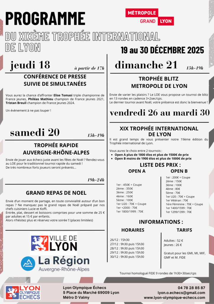 Le XIXème Trophée International d’ Auvergne-Rhône-Alpes du 26 au 30 décembre ! 9 rondes en 1h30 + 30s/coup