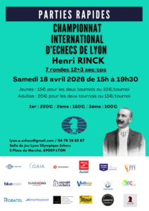 Les Championnats Internationaux de Lyon, Henri RINCK, auront lieu en partie à l’Ecole d’Ingénieurs ECAM LaSalle, campus de Lyon (11 au 15 avril) et l’autre partie au Lyon Olympique Échecs (LOE) du 8 au 10 avril puis de nouveau du … Lire plus