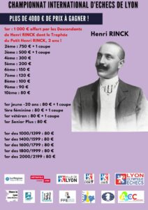 Nous sommes heureux de vous annoncer la nouvelle édition du Championnat International d’échecs de Lyon Henri RINCK du samedi 11 au mercredi 15 avril 2026 ! Un évènement qui réunit plus de 130 joueurs d’une dizaine de nationalités différentes !
