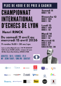 Nous sommes heureux de vous annoncer la nouvelle édition du Championnat International d’échecs de Lyon Henri RINCK du samedi 11 au mercredi 15 avril 2026 ! Un évènement qui réunit plus de 140 joueurs d’une dizaine de nationalités différentes !