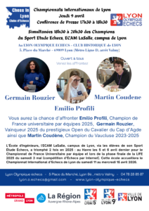 Nous avons le plaisir, aujourd’hui de vous inviter aux Championnats Internationaux de Lyon d’Echecs Henri RINCK (8-19 avril 2026) et en particulier le jeudi 9 avril à notre Conférence de Presse de 17h à 18h