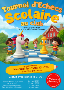 Le Lyon Olympique Échecs lance un circuit de tournois scolaires d’Échecs les mercredis après-midis de 15h à 19h. Le premier tournoi aura lieu le mercredi 1ᵉʳ avril au club, 5, Place du Marché à Lyon 9ᵉ. Le tournoi est limité