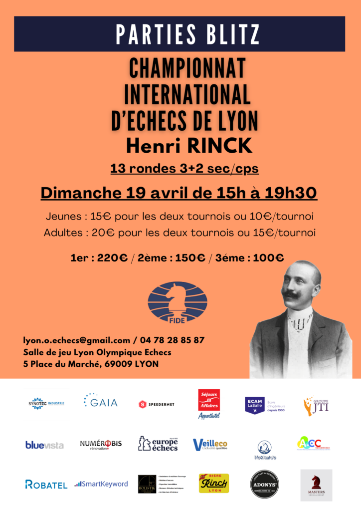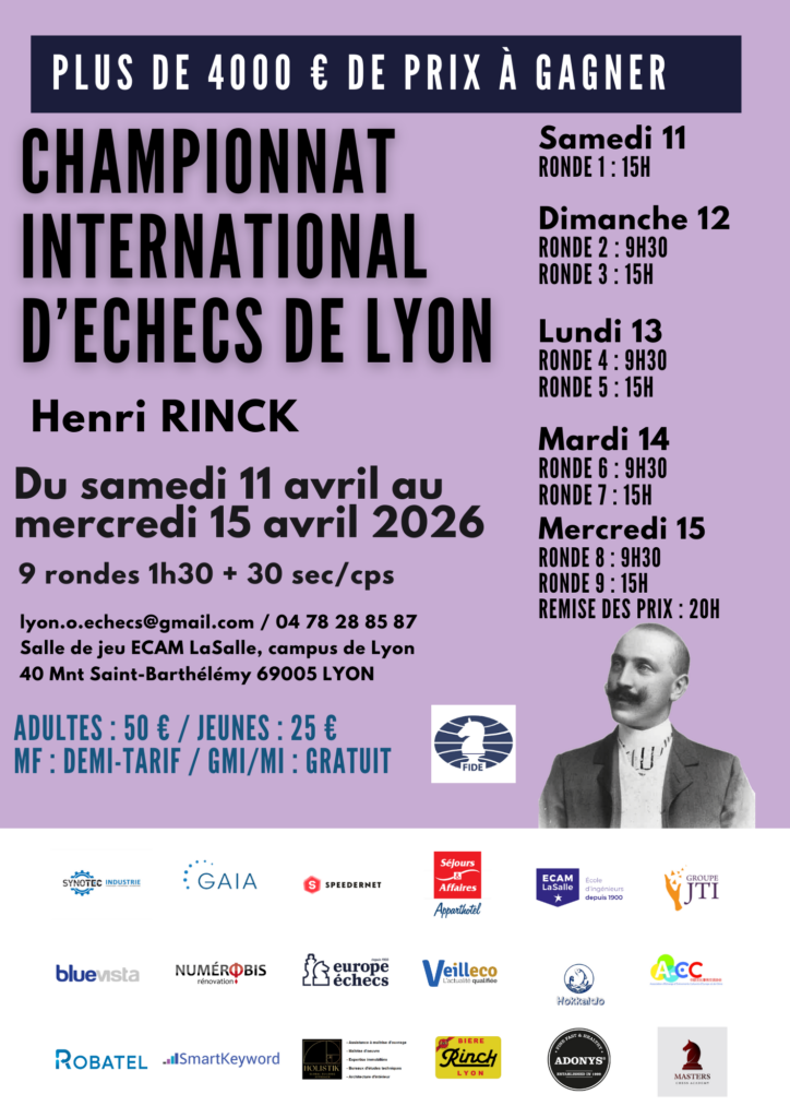 Du 8 au 20 avril 2026, le Lyon Olympique Échecs organise une nouvelle édition du Championnat International d’Échecs de Lyon Henri RINCK. Cette année encore, le rendez-vous promet d’être riche en émotions, en affrontements de haut niveau et en moments de partage autour de notre passion commune : le jeu d’Echecs.