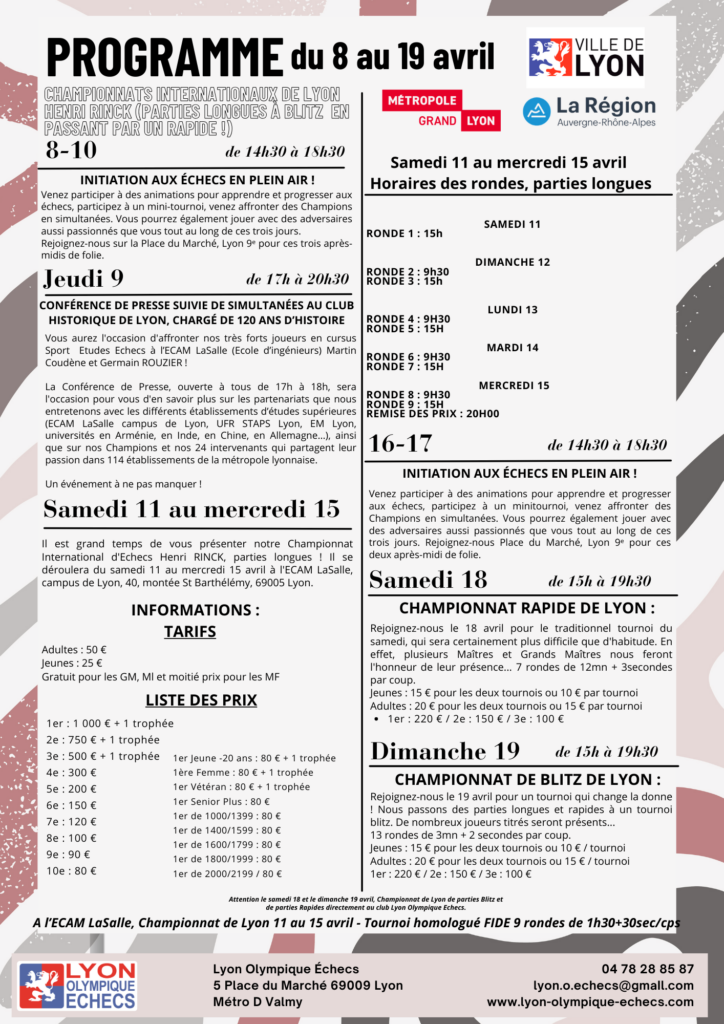 Du 11 au 15 avril, place à la compétition classique avec le tournoi principal, homologué FIDE, qui se jouera dans le cadre prestigieux du campus de Lyon ECAM LaSalle (40 montée Saint-Barthélémy, Lyon 5e).