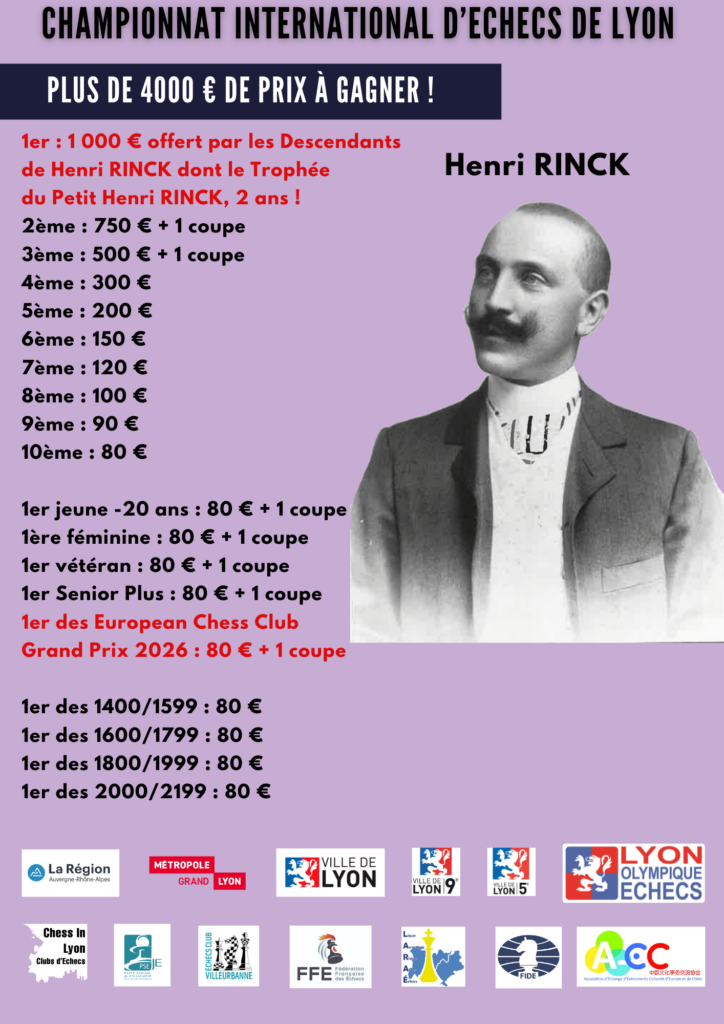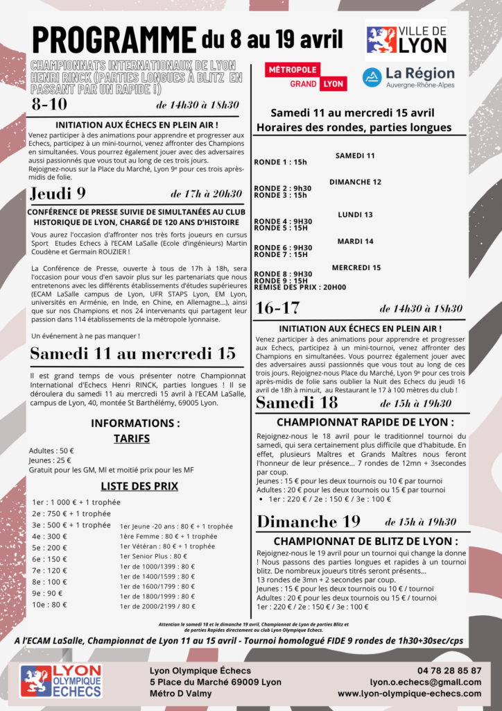 Nous sommes heureux de vous annoncer la nouvelle édition du Championnat International d’Echecs de Lyon Henri RINCK du samedi 11 au mercredi 15 avril 2026 ! Il se déroulera de nouveau à l’Ecole d’Ingénieur ECAM LaSalle, campus de Lyon, située 40, Montée Saint Barthélémy, 69005 Lyon et sera suivi des Championnats Internationaux de Lyon de parties rapides (18 avril) et parties blitz (19 avril) mais cette fois-ci dans le club Historique de Lyon, Lyon Olympique Echecs, situé, 5, Place du Marché, 69009 Lyon !