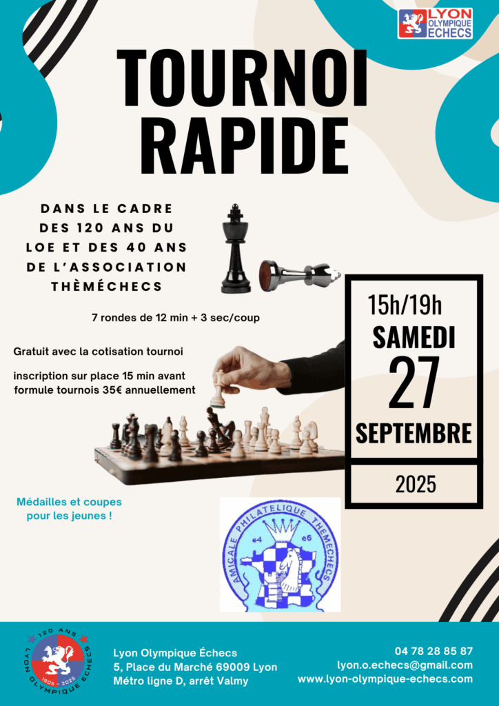 Du 25 au 28 septembre 2025, le Lyon Olympique Échecs (LOE), l’un des plus anciens clubs d’échecs de France, célébrera ses 120 ans d’existence et les 40 ans de l’association Thèméchecs. Cet anniversaire sera marqué par la présence d’anciens Champions de France pour des simultanées (Christian BAUER le jeudi 25 septembre 18h30, Eric PRIE le vendredi 26 septembre à 18h30, Emmanuel BRICARD samedi 27 septembre à 19h30 – Les 3 sont Grands Maîtres Internationaux). Ces célébrations seront accompagnées d’un tournoi de parties rapides en 7 rondes et une vente aux enchères le samedi 27 septembre. De nombreuses autres animations rendant hommage à l’Histoire et au Patrimoine du jeu d’Echecs sont aussi prévues !