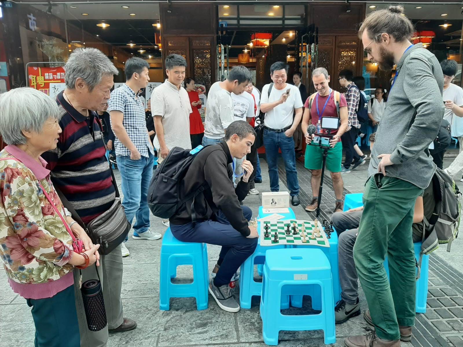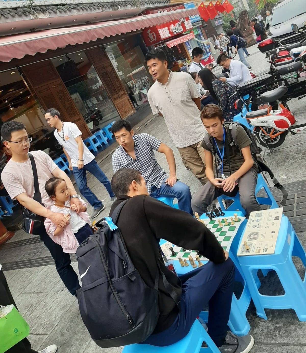 Il était déjà midi lorsque nous avons quitté le Marché des antiquités pour nous rendre dans un restaurant voisin. Vingt minutes d’attente… L’esprit du jeu d’échecs n’étant pas loin, nos jeunes Idriss et Thomas ont, disputé quelques parties devant le restaurant en pleine rue sous les regards des passants amusés !