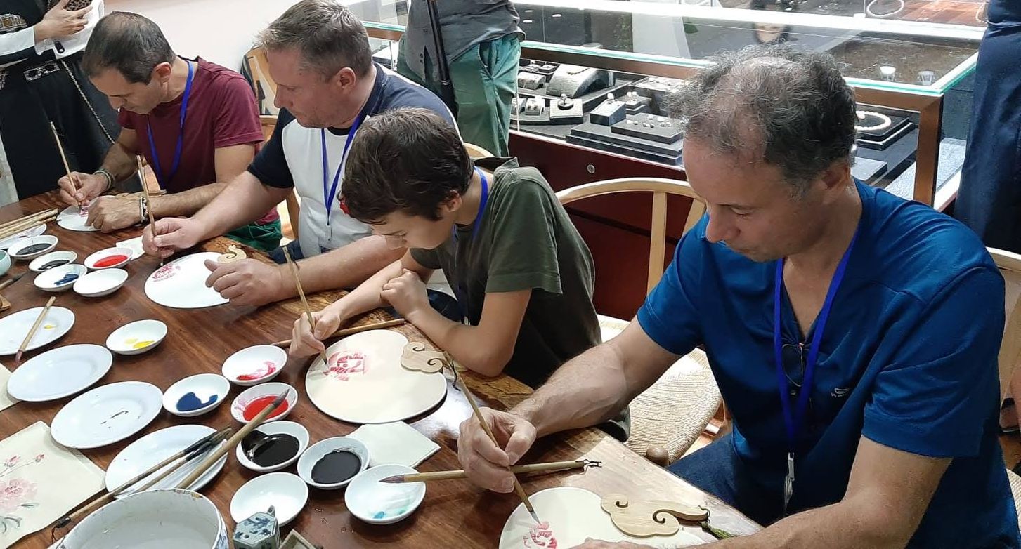 Après tout cet apprentissage puis dégustations multiples, notre délégation eu droit à un second Art : celui de la Calligraphie. Pinceaux de toutes tailles et de toutes textures, encres de Chine aux multiples couleurs, tout cela sous la supervision bienveillante de Mme YAO. Tout était réuni pour que nous fassions de belles œuvres… Mais malheureusement on ne peut devenir artiste et chinois en quelques jours ! Malgré notre bonne volonté, nous avons vite appelé nos hôtes à la rescousse pour ramener en France un souvenir plus digne… de notre talent !