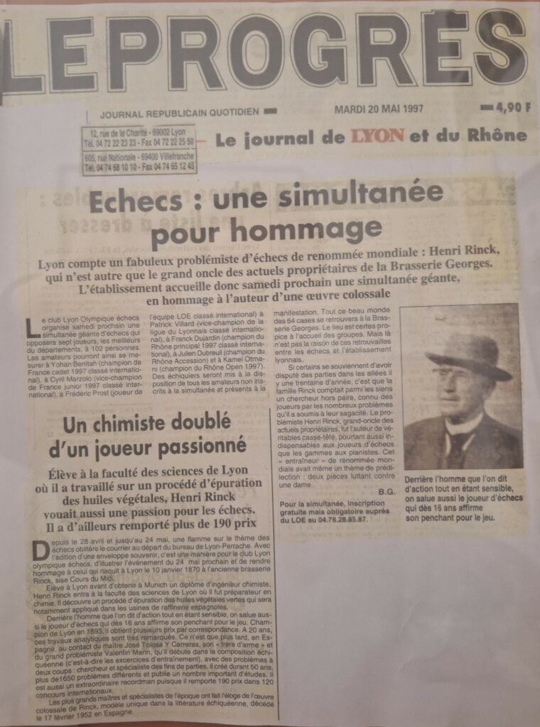 Pour les plus anciens du club, on se souvient encore des Assemblées Générales à la Brasserie Georges dont ce fameux 24 mai 1997 avec une simultanée géante du LOE directement sur place. Notez que la Brasserie fête d’ailleurs ses 130 ans cette année ! Ce fut sept simultanéistes, dont à l’époque les déjà talentueux Yohan BENITAH et Cyril MARZOLO, qui affrontèrent 116 joueurs. Magnifique accueil de Didier RINCK, petit neveu de Henri RINCK et de sa Maman Simone, nièce directe d’Henri qui au micro nous lança plusieurs anecdotes d’époque. La présence du Docteur Jean MENNERAT, (le plus grand collectionneur de tous les temps de livres d’Echecs (plus de 29 000 !) avait aussi été remarquée.