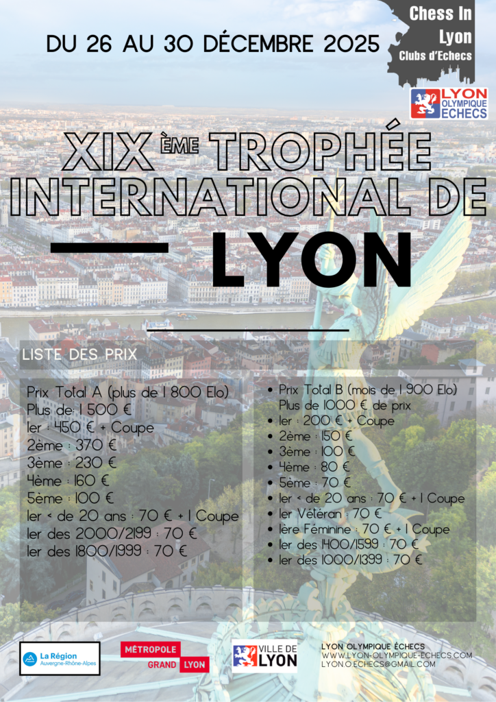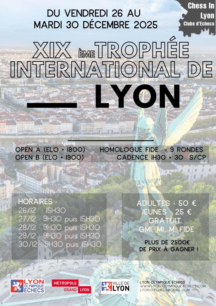 Nous sommes heureux de vous annoncer le lancement des inscriptions du XIXème Trophée International de Lyon qui aura lieu au Lyon Olympique Échecs du vendredi 26 au mardi 30 décembre 2025.