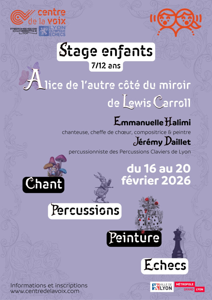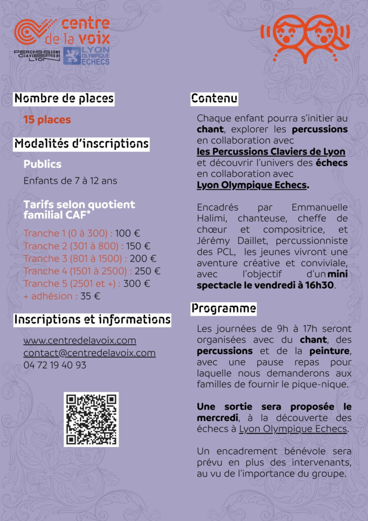 Durant ce stage, chaque enfant pourra s’initier au chant avec Emmanuelle Halimi, chanteuse, cheffe de chœur, compositrice et peintre, explorer les percussions avec Jérémy Daillet, percussionniste chez les Percussions Claviers de Lyon et découvrir l’univers des échecs pendant la sortie au Lyon Olympique Echecs avec l’objectif d’un mini spectacle le vendredi à 16h30.