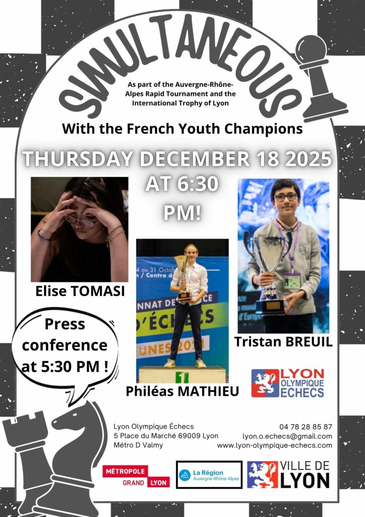 The tournaments will take place from Thursday 18 to Tuesday 30 December 2025 at the Lyon Olympique Échecs (LOE) premises at 5, Place du Marché 69009 Lyon (Metro line D, Valmy stop).