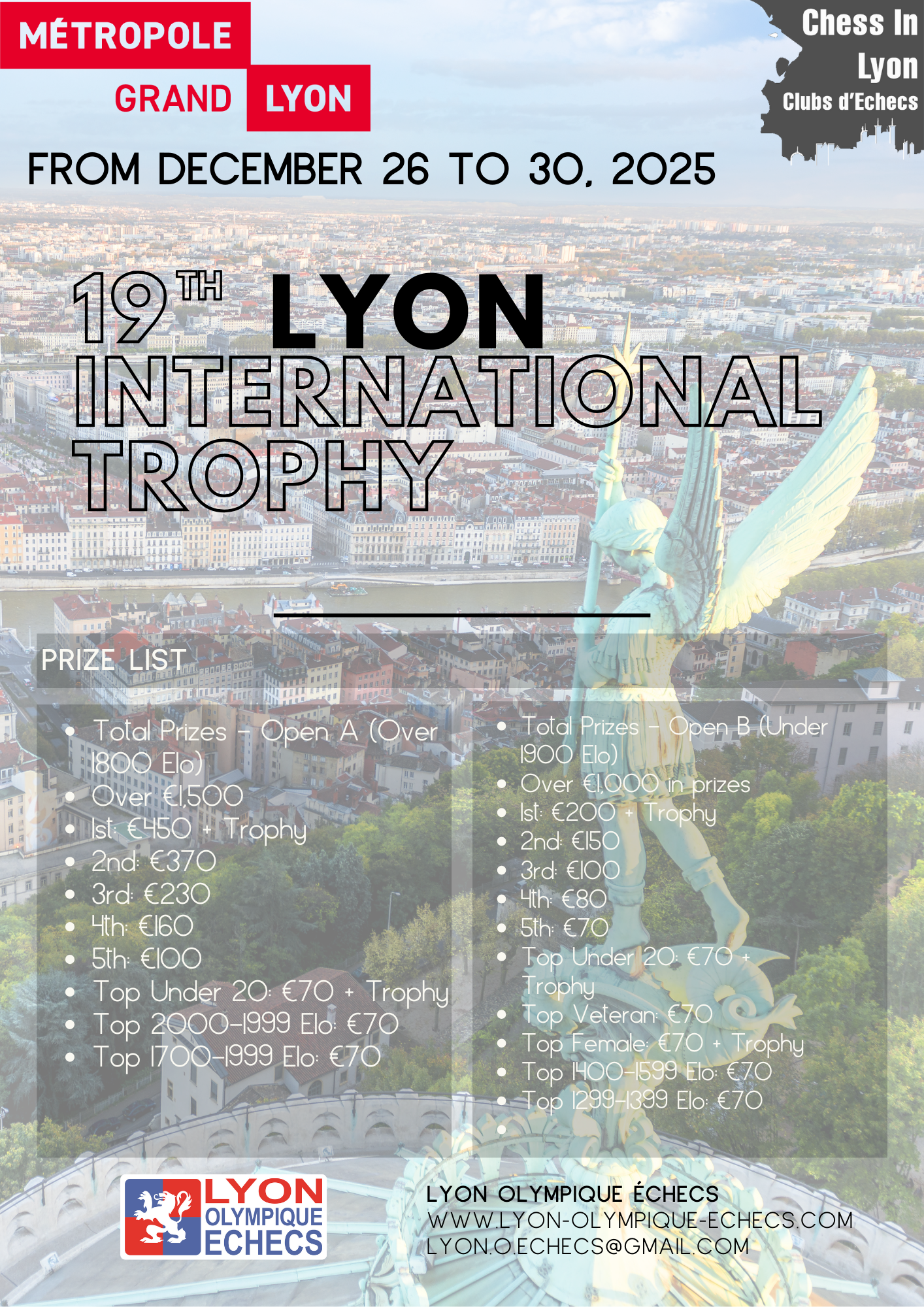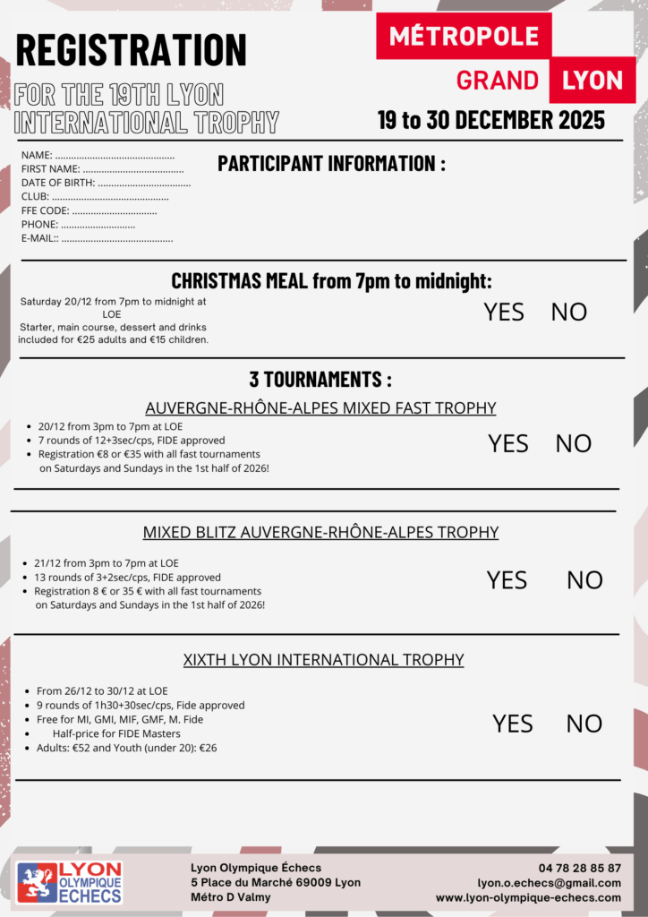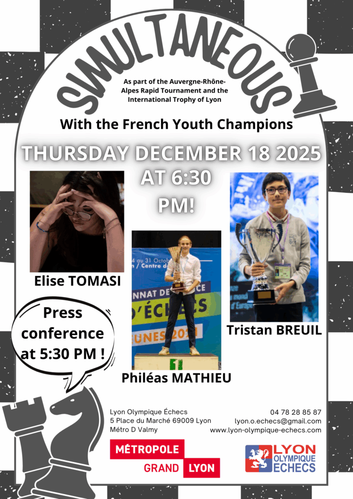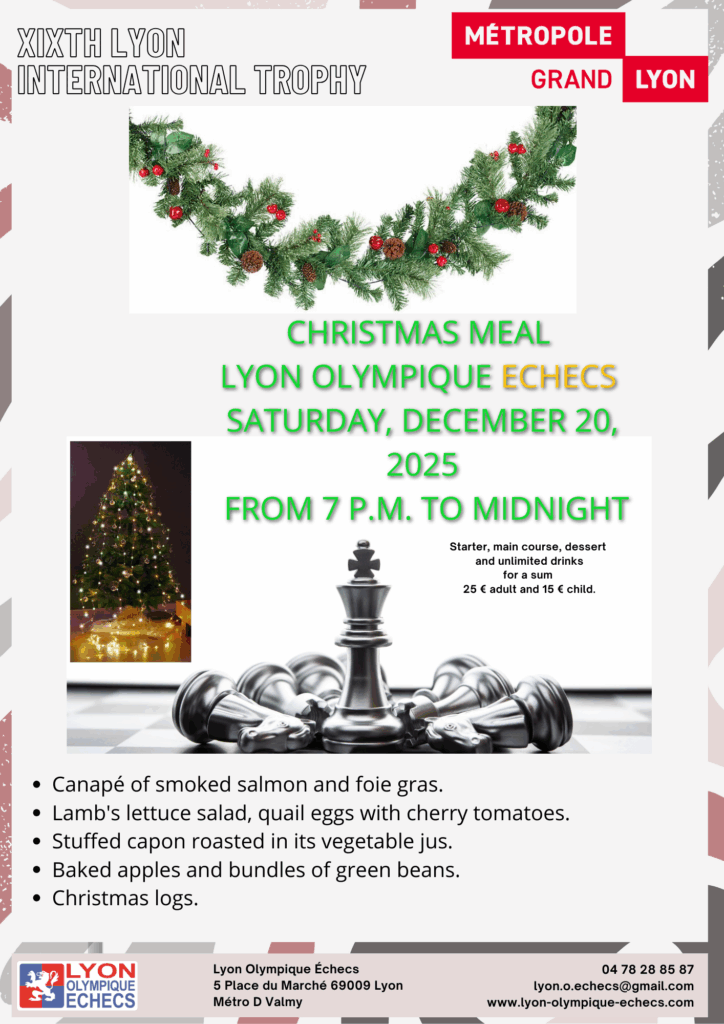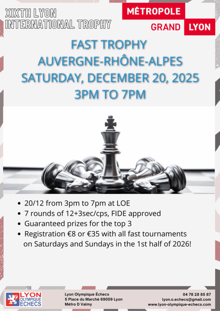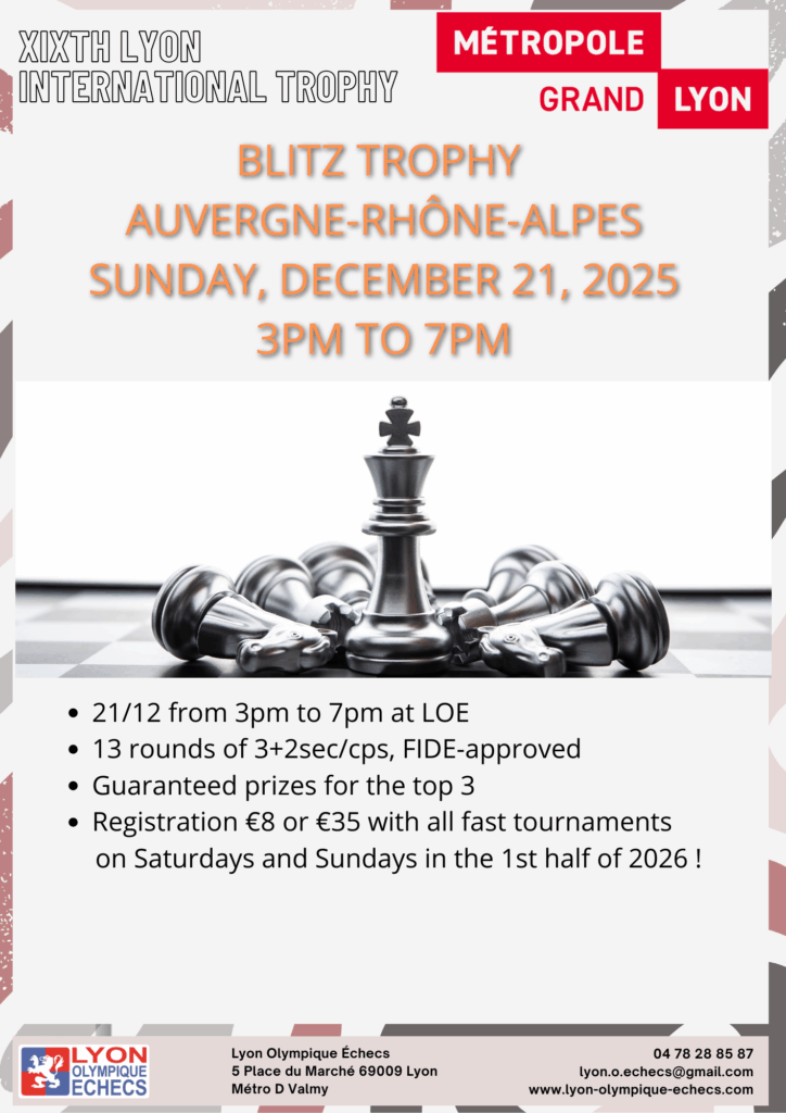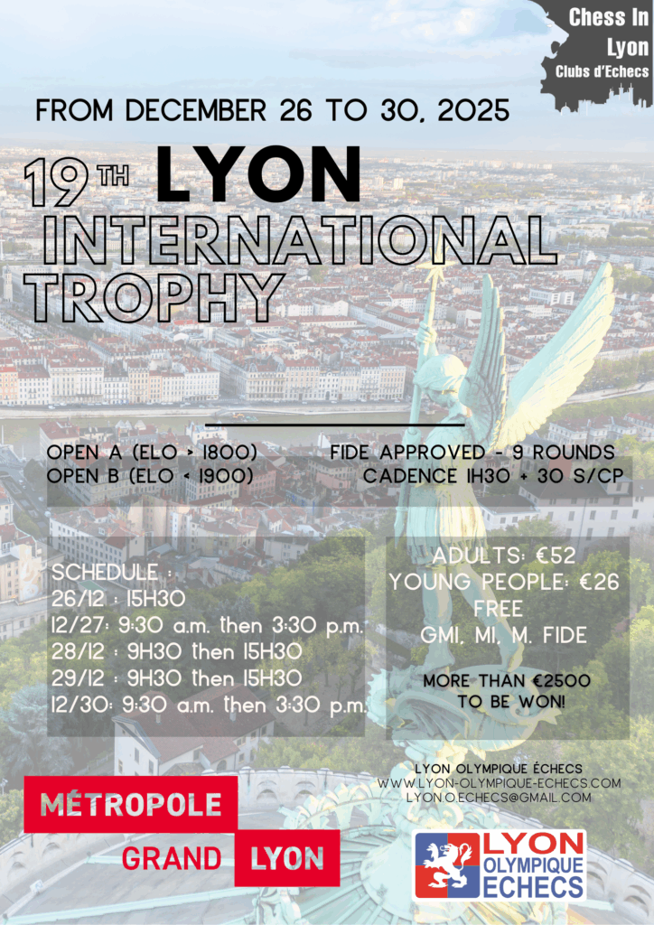The tournaments will take place from Thursday 18 to Tuesday 30 December 2025 at the Lyon Olympique Échecs (LOE) premises at 5, Place du Marché 69009 Lyon (Metro line D, Valmy stop).