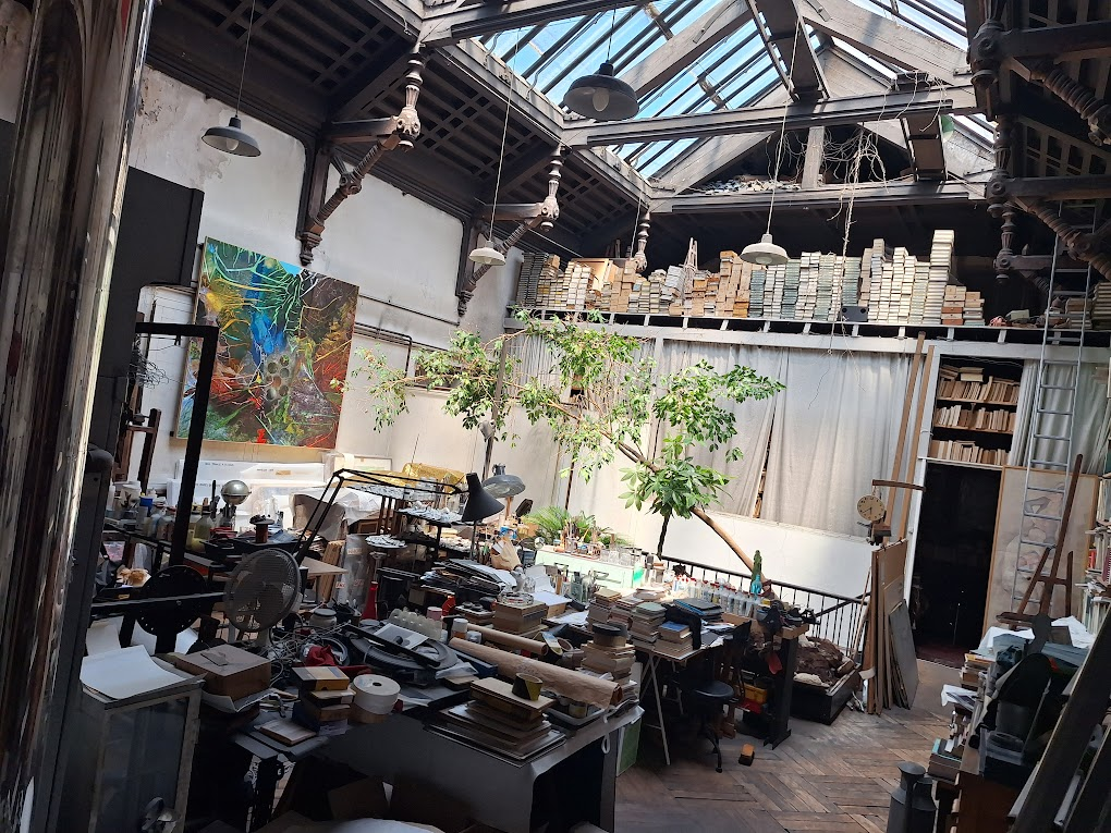 L’immeuble dans lequel se situe l’atelier date de 1830. Ce lieu foisonnant de matériel, d’images, d’objets et de livres est emblématique de la pensée de Max ou de Marie-Claude ! Il livre les traces de leurs multiples activités. La monographie de l’artiste est fondée sur l’archéologie de ce laboratoire.