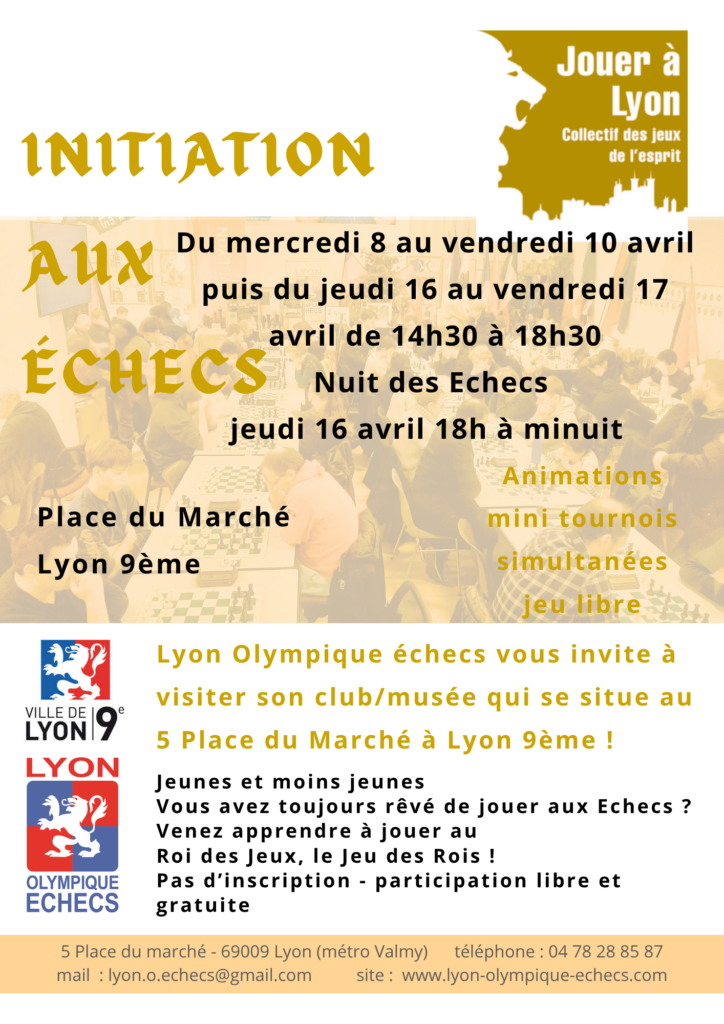 Les Initiations en plein air de 14h30 à 18h30 sur la Place du Marché à Lyon 9ème sont aussi à souligner du mercredi 8 au vendredi 10 avril puis du jeudi 16 au vendredi 17 avril sans oublier LA NUIT DES ECHECS !