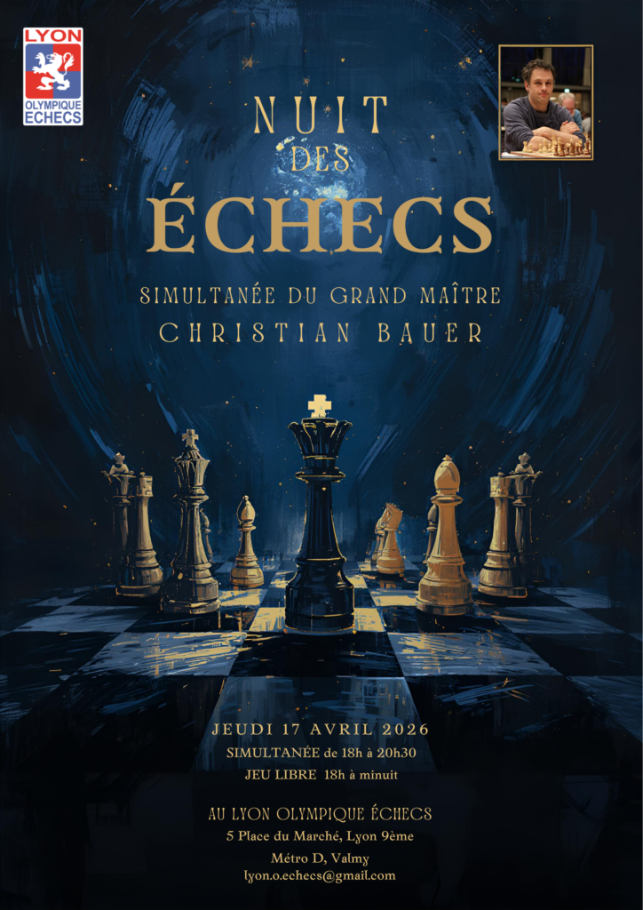 En effet, le jeudi 17 avril, participez à la Nuit des Échecs en plein air de 18h à minuit sur la Place du Marché. Profitez de nombreux jeux d’Echecs, dont un jeu géant, et venez nombreux jouer sous les étoiles. Pas d’inquiétude si le temps se couvre, les locaux du Lyon Olympique Échecs accueilleront l’évènement. Ouvert à tous, animations gratuites et buvette prévue. Plusieurs Maîtres seront présents, venez les affronter ! De surcroit c’est le Grand Maître International Christian BAUER qui nous fera l’honneur de sa présence ! Il disputera une simultanée de 18h à 20h30 ; aussi venez nombreux pour le défier !