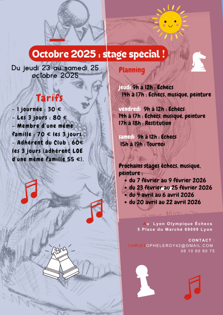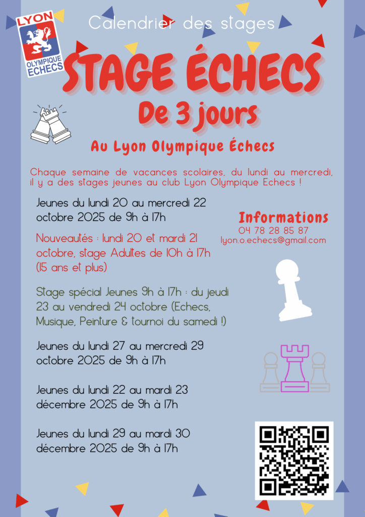 Durant les périodes de vacances scolaires, le Lyon Olympique Echecs propose des stages aux enfants du lundi au mercredi de 8h30 à 17h30 toutes les semaines de vacances scolaires. En juillet et août les stages s’étendent aussi du jeudi au samedi avec Echecs, Peinture et Musique pour les 12 ans et moins.