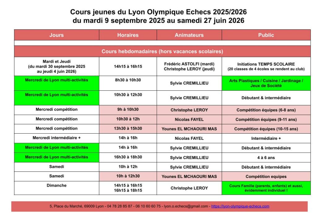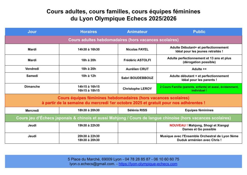 Le Lyon Olympique Échecs propose des cours toutes les semaines hors vacances scolaires. Vous trouverez le détail dans la rubrique des cours !