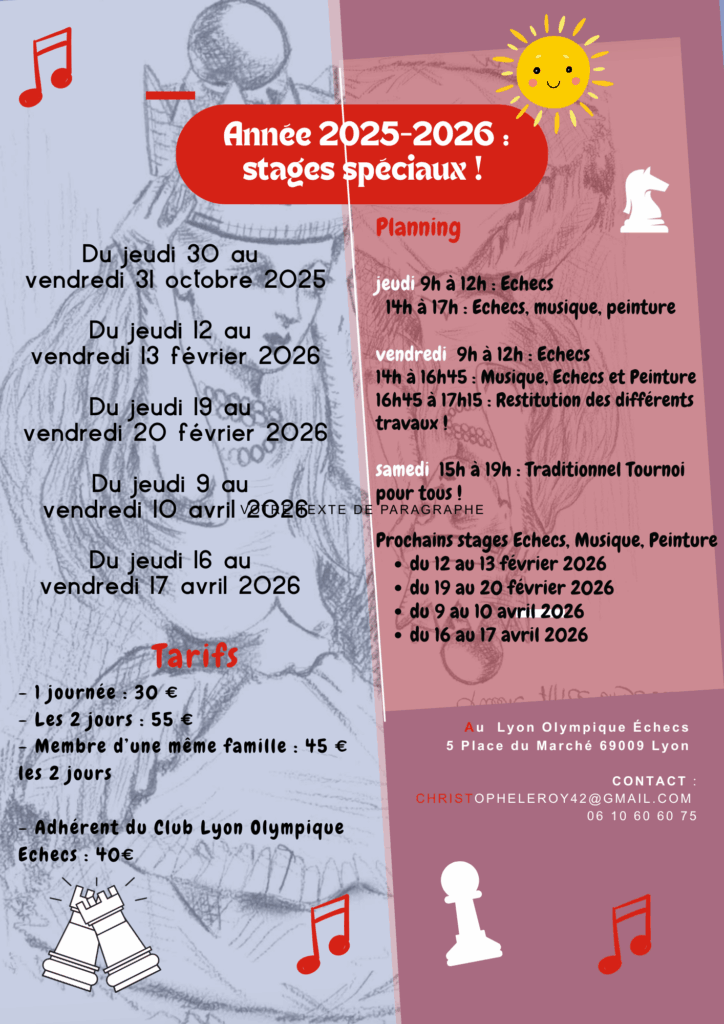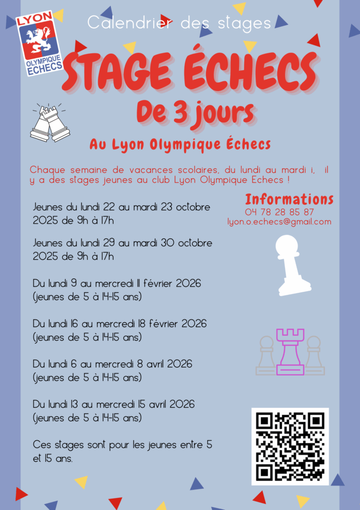 Durant les périodes de vacances scolaires, le Lyon Olympique Echecs propose des stages aux enfants du lundi au mercredi de 8h30 à 17h30 toutes les semaines de vacances scolaires. En juillet et août les stages s’étendent aussi du jeudi au samedi avec Echecs, Peinture et Musique pour les 12 ans et moins.