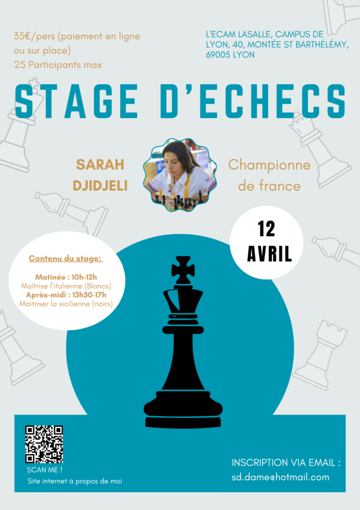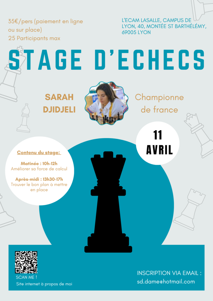 À l’occasion du Championnat de Lyon Henri RINCK, Sarah DJIDJELI organise la première édition de mon stage en présentiel, dédié à différentes thématiques pour progresser aux échecs.