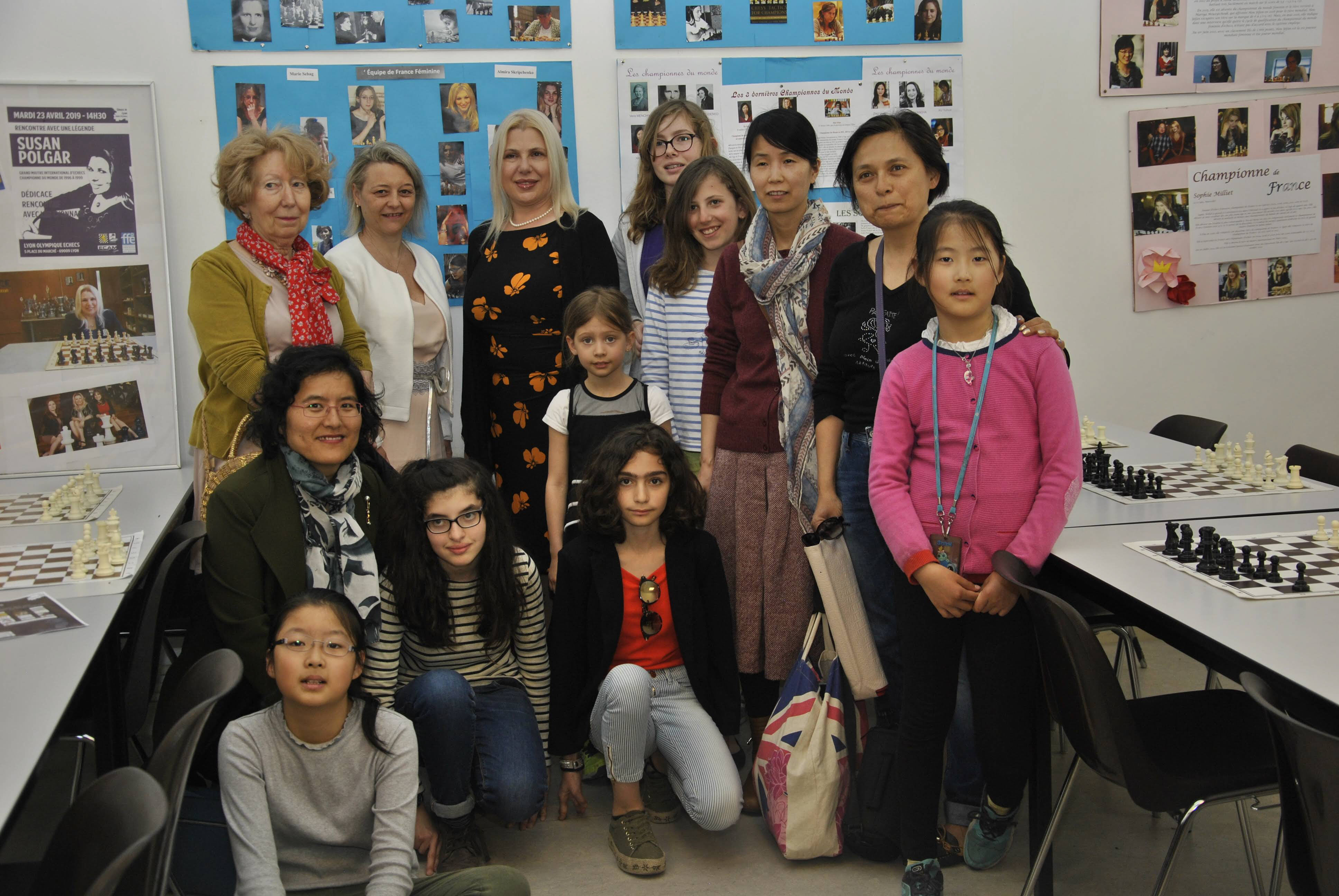 Mardi après-midi, l’ancienne championne du Monde féminine d’échecs, Susan POLGAR, a visité le club LOE à Vaise et notamment la salle consacrée aux cours en présence des féminines de CHESS IN LYON et de Sylvie (en blanc à droite de la championne) la responsable et animatrice de cours pour les moins de 10 ans du LOE.