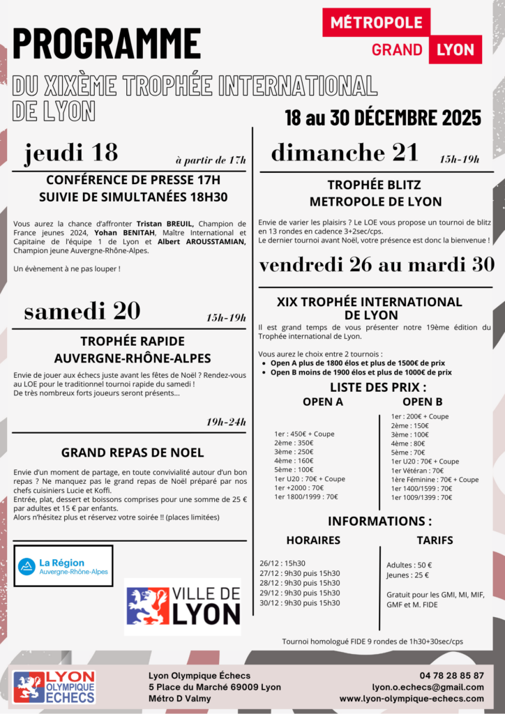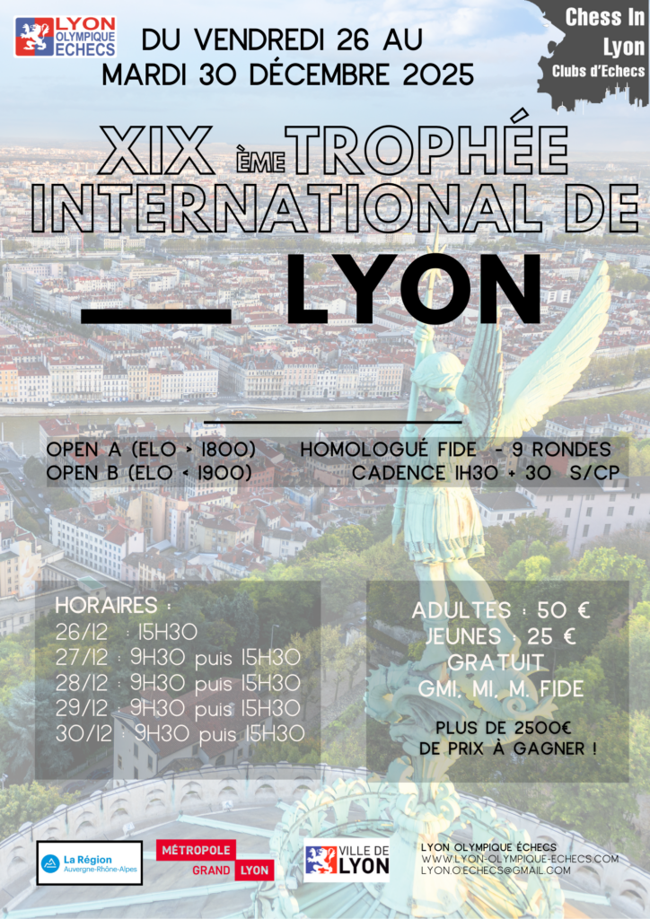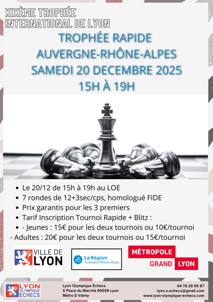Le Trophée International cadence rapide aura lieu le samedi 20 décembre 2025 au Lyon Olympique Echecs.