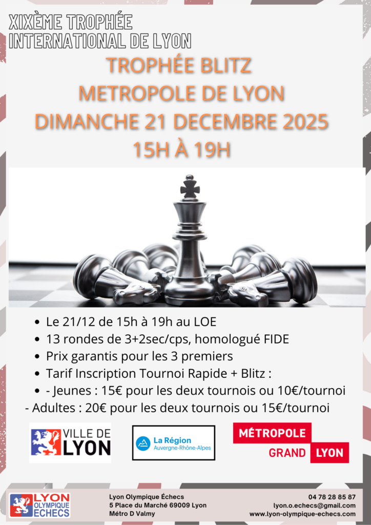 Le Trophée International cadence blitz aura lieu le dimanche 21 décembre 2026 au Lyon Olympique Echecs.