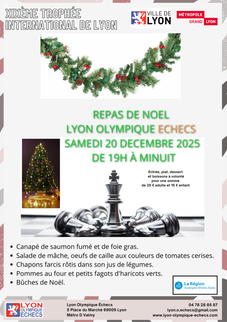 Comme chaque année, le Lyon Olympique Echecs organise un Repas de Noel pour célébrer la fin d’année dans la bonne humeur.